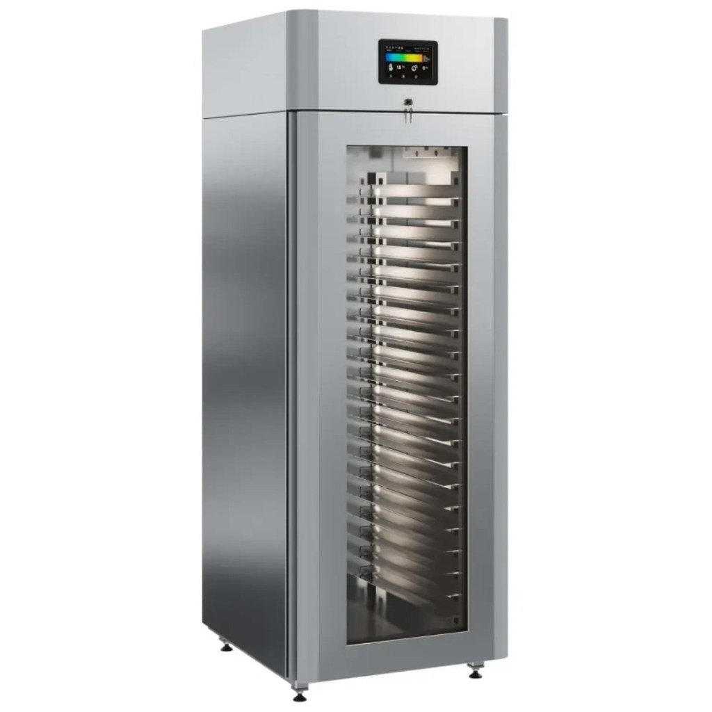 Каталог оборудования Холодильное оборудованиеШкафы холодильныеСпециализированные холодильные шкафыШкаф холодильный для хлебопекарных производств Polair CS107-Bakery Br со стеклом (Тип 1) Шкаф холодильный для хлебопекарных производств Polair CS107-Bakery Br со стеклом (Тип 1) Код товара: 062-622 Поделиться: WhatsAppTelegram СравнитьДобавить в КПВ избранное 0 414 545 ₽ В корзину 0 шт Под заказСамовывоз сегодня бесплатно Взять в кредит Купить в лизинг Получить консультацию в WhatsApp Описание Характеристики Отзывы 0 Инструкции 5 Шкаф холодильный для хлебопекарных производств Polair CS107-Bakery Br со стеклом (Тип 1) предназначен для создания оптимальных условий хранения и расстойки заготовок из теста на предприятиях общественного питания и торговли. Цельнозаливной корпус выполнен из нержавеющей стали, дверь — стеклопакет. Оборудование стабильно работает при температуре окружающей среды до +40 °C. В комплект входят 20 пар направляющих размером 400×600 мм. Особенности: Широкий функционал: охлаждение, замедление ферментации, хранение, регенерация, брожение и расстойка Динамическое охлаждение с мягким обдувом без заветривания и автоматическая оттайка с системой испарения конденсата Панель управления с 5" дисплеем: контроль температуры, влажности (регулируется от 60 до 95 %), скорости вентилятора и времени, а также возможность создания и сохранения программ Встроенный ультразвуковой увлажнитель (необходима система водоочистки и канализация) Эргономичная конструкция: верхнее расположение агрегата, распашная дверь со стеклопакетом, механизм самозакрывания, педаль для открытия, съёмные направляющие и легко заменяемый уплотнитель с магнитной вставкой Дополнительная защита: пластиковый бордюр по периметру камеры для предотвращения повреждений от тележек Простота ухода: штампованное углубление в дне корпуса для сбора загрязнений Экологичный хладагент R290 и энергоэффективность: потребляемая мощность — 0,55 кВт (охлаждение), 0,9 кВт (нагрев) Толщина стенки корпуса — 43 мм Polair CS107-Bakery Br со стеклом (Тип 1) — надёжный и многофункциональный шкаф, который обеспечивает полное управление процессами брожения и расстойки теста. Современная система охлаждения и увлажнения, продуманная конструкция и удобное управление делают его оптимальным решением для пекарен и кондитерских, стремящихся к стабильному качеству и высокой производительности.Изображение товара, представленного на фото, может отличаться от его фактического вида. Показать все Габаритные размеры697×1005×1960 ммДиапазон рабочей температурыот -10 до +40 °CДлина697 ммШирина1005 ммВысота1960 ммОбъём700 лКол-во дверей1 Тип двериСтеклянная Уровень влажностиот 60 до 95 %Направляющие под EN 40*6020 Расстояние между направляющими60 ммХолодильный агрегатВстроенный Тип оттайкиАвтоматическая Тип охлажденияДинамический ПодсветкаЕсть ХладагентR290 Вес нетто180 кгБрендPolairВсе специализированные холодильные шкафы Из нержавейки Оставить отзыв Еще никто не оставил отзыв на этот товар Схема POLAIR CS107 Bakery Br.jpgИнструкция на POLAIR CS107 Bakery Br.pdfБрошюра на хлебопекарное оборудование POLAIR.pdfДекларация о соответствии.pdfСертификат соответствия.pdf Похожие товары Перейти в каталог Под заказ 392 700 ₽ Шкаф холодильный для вызревания мяса Polair CS107 Meat черный, со стеклом (Тип 2) Под заказ 391 000 ₽ Шкаф холодильный для вызревания сыра Polair CS107 Cheese полки нерж. Под заказ 419 900 ₽ Шкаф холодил
