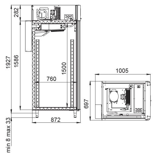 Каталог оборудования Холодильное оборудованиеШкафы холодильныеСпециализированные холодильные шкафыШкаф холодильный для вызревания салями Polair CS107 Salami со стеклом Шкаф холодильный для вызревания салями Polair CS107 Salami со стеклом Код товара: 062-631 Поделиться: WhatsAppTelegram СравнитьДобавить в КПВ избранное 0 385 050 ₽ В корзину 0 шт Под заказСамовывоз сегодня бесплатно Взять в кредит Купить в лизинг Получить консультацию в WhatsApp Описание Характеристики Отзывы 0 Инструкции 5 Шкаф холодильный для вызревания салями Polair CS107 Salami со стеклом предназначен для приготовления и хранения салями, сыровяленых колбас и других мясных деликатесов на предприятиях общественного питания и торговли. Корпус цельнозаливной конструкции выполнен из нержавеющей стали снаружи и внутри (кроме задней стенки), что обеспечивает высокую прочность и долговечность. Дверь выполнена в виде стеклопакета для удобного визуального контроля. Оборудование рассчитано на работу при температуре окружающей среды до +40 °С. Особенности: Динамическое охлаждение с мягким обдувом без заветривания Верхнее расположение агрегата Автоматическая оттайка с системой испарения конденсата Русифицированная многофункциональная панель управления с дисплеем 5" и возможностью создания и сохранения собственных программ Встроенный ультразвуковой увлажнитель (необходима подача очищенной воды и подключение к канализации) UV-лампа для обеззараживания воздуха внутри камеры 3 пары направляющих с тремя перекладинами и подвесами для колбас Регулируемый уровень влажности: от 60 до 95 % Распашная дверь с заливной теплоизоляцией, встроенной ручкой и магнитным уплотнителем Отключаемая внутренняя LED-подсветка Штампованное углубление в дне корпуса для удобства ухода Педаль для удобного открытия двери Хладагент R290 (пропан) Толщина стенки корпуса: 43 мм Polair CS107 Salami со стеклом — это профессиональный шкаф, разработанный специально для мясных деликатесов. Он обеспечивает оптимальные условия для ферментации и хранения продукции за счёт точного контроля температуры и влажности, продуманной конструкции и удобного функционала. Такой шкаф станет надёжным решением для мясных цехов, гастробаров и специализированных магазинов.Изображение товара, представленного на фото, может отличаться от его фактического вида. Показать все Габаритные размеры697×1005×1960 ммДиапазон рабочей температурыот -2 до +30 °CДлина697 ммШирина1005 ммВысота1960 ммОбъём700 лКол-во дверей1 Тип двериСтеклянная Уровень влажностиот 60 до 95 %Холодильный агрегатВстроенный Тип оттайкиАвтоматическая Тип охлажденияДинамическое ПодсветкаЕсть UV-лампаЕсть ХладагентR290 Вес нетто160 кгВес брутто190 кгБрендPolairВсе специализированные холодильные шкафы Из нержавейкиВсе специализированные холодильные шкафы Стеклянная дверь Оставить отзыв Еще никто не оставил отзыв на этот товар Схема POLAIR CS107 Salami.jpgИнструкция на POLAIR CS107 Salami.pdfБрошюра на POLAIR CS107 Salami.pdfДекларация о соответствии.pdfСертификат соответствия.pdf Похожие товары Перейти в каталог Под заказ 392 700 ₽ Шкаф холодильный для вызревания мяса Polair CS107 Meat черный, со стеклом (Тип 2) В наличии 405 365 ₽ Шкаф холодильный для хлебопекарных производств Polair CS107 Bakery Br черный, со стеклом (Тип 2) Под заказ 373 915 ₽ Шкаф холодильный для вызревания салями Polair CS107 Salami черный, со стеклом Под заказ 419 900 ₽ Шкаф холодильный для хлебопекарных пр