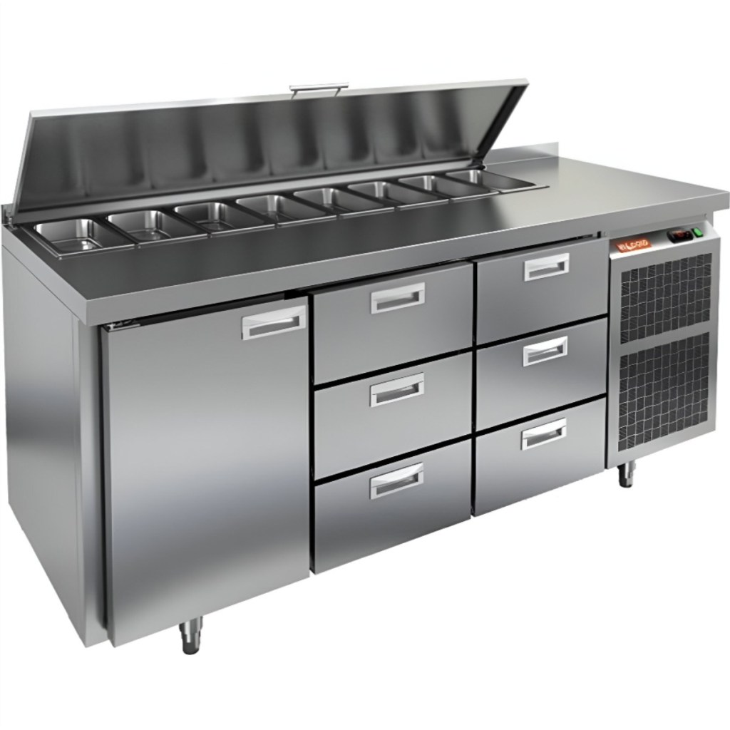 Такая конструкция позволяет повару работать быстрее и эффективнее, так как все необходимые продукты находятся под рукой. Корпус и столешница выполнены из прочной нержавеющей стали, устойчивой к коррозии и легко поддающейся санитарной обработке. Металлическая крышка защищает продукты от загрязнений и сохраняет их свежесть.