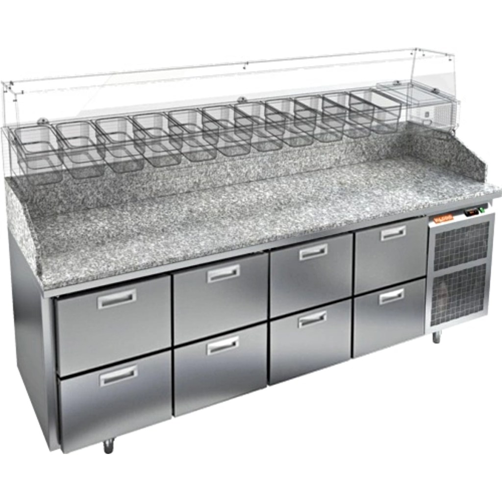 Каталог оборудования Холодильное оборудованиеСтолы охлаждаемыеСтолы холодильные для пиццыСтол холодильный для пиццы HiCold PZ3-2222/GN камень Стол холодильный для пиццы HiCold PZ3-2222/GN камень Код товара: 065-016 Поделиться: WhatsAppTelegram СравнитьДобавить в КПВ избранное 0 406 521 ₽ В корзину 0 шт Под заказСамовывоз сегодня бесплатно Взять в кредит Купить в лизинг Получить консультацию в WhatsApp Описание Характеристики Отзывы 0 Стол холодильный для пиццы HiCold PZE3-2222/GN камень предназначен для использования в пиццериях, кафе, магазинах и ресторанах. Он идеально подходит для раскатки теста, подготовки ингредиентов и кратковременного хранения скоропортящихся продуктов. Витрина приобретается отдельно. Стол сочетает корпус из нержавеющей стали и гранитную столешницу, которая устойчива к механическим и температурным нагрузкам и удобна в работе с тестом. Такая конструкция обеспечивает долговечность, гигиеничность и простоту ухода. Особенности модели: Охлаждение: динамическое — равномерное поддержание температуры Оттайка: автоматическая — удобство и экономия времени Панель управления: электронная — точная настройка температуры Ножки: регулируемые по высоте — устойчивость на неровной поверхности Ящики: 8 выдвижных ящика — удобное хранение ингредиентов Уплотнители: легкозаменяемые магнитные — герметичность и простота обслуживания Толщина теплоизоляции: 50 мм — сохранение холода и энергоэффективность Рабочая поверхность: глубина 680 мм — удобство работы HiCold PZE3-2222/GN камень— это надёжный и функциональный холодильный стол для пиццы, который сочетает прочность, эргономику и эффективное охлаждение. Благодаря гранитной столешнице, корпусу из нержавеющей стали, двум глухим дверям и двум выдвижным ящикам он станет универсальным решением для профессиональной кухни. Изображение товара, представленного на фото, может отличаться от его фактического вида. Показать все Габаритные размеры2280×700×1050 ммДиапазон рабочей температурыот +2 до +10 °CРасположение агрегатаБоковое Материал столешницыГранитная Тип столаС ящиками Объём660 лКоличество ящиков8 штРазмер полки530×325 ммНапряжение220 ВМощность0,5 кВтТип охлажденияДинамическое Тип оттайкиАвтоматическая Габариты в упаковке2430×850×1140 ммВес нетто270 кгВес брутто320 кгБрендHicoldВсе холодильные столы для пиццы HicoldВсе нержавеющие холодильные столы для пиццы Оставить отзыв Еще никто не оставил отзыв на этот товар Ранее просмотрено Под заказ 222 472 ₽ Стол холодильный для пиццы HiCold PZ3-11/SN 3 камень